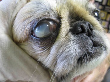 Catarata é uma opacidade na lente. A lente normal é completamente transparente e enfoca a imagem na retina por um processo de acomodação. A lente é isolada dentro de uma cápsula, mas se essa cápsula se altera, o corpo do animal entra em contato com as proteínas da lente e começa a atacá-las, produzindo uma inflamação muito dolorosa. A lente então se torna opaca, impedindo a visão. Essa opacidade pode ocupar uma pequena área da lente ou pode afetar a lente inteira. É uma anormalidade que merece atenção, pois pode levar a consequências sérias e até à perda do globo ocular.
