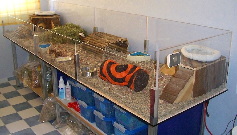 Se a escolha for criá-lo em gaiola ela deve ser espaçosa, de um só andar, feita de telas aramadas e com bandejas pesadas. É preferível aquela que tem abertura em cima para permitir que o dono se interaja melhor com o animal. O tamanho mínimo é 76 x 91 cm para um só. Quando dois, o espaço mínimo é 76 x 127 cm. Cubra o fundo da gaiola com 2 a 5 centímetros de produtos de papel ou serragem. Trocar frequentemente (a cada 3 ou 4 dias) irá prevenir odores e ajudar o Porquinho-da-índia a manter a saúde. Cama de lã é outra alternativa. Não se recomenda: serragem de árvores aromáticas, que podem contribuir para problemas respiratórios; pó de serra e areia para gatos também não são boas escolhas para forração. O lugar onde a gaiola vai ficar deve ser claro, longe de correntes de ar, com uma temperatura estável entre 18 e 24ºC e sem incidência direta do sol. Acessórios: bebedouro, vasilhas pequena e pesada para ração, bebedouro tipo chupeta, caixa coberta para dormir e uma caixa-transporte para levá-lo ao veterinário e para viajar. Agora, venhamos e convenhamos, quem tiver condições de montar um palacete como esse da foto o amiguinho vai agradecer e muito.