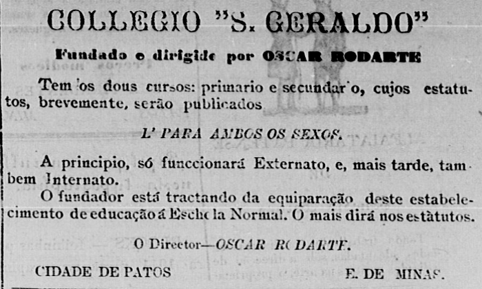 Havia o Colégio São Geraldo, dirigido pelo prof.º Oscar Rodarte, escola particular, impunha nela o prof.º Oscar a sua disciplina e o seu método de ensino; em cima da mesa do mestre, uma rígida e sólida “Santa Luzia” de madeira de lei, e 5 furos e posso garantir que funcionava; funcionava das 7 às 11 horas e do meio dia às 5, sem recreio; eram 9 horas diárias de “escola”; lá em dois anos, tive de aprender a ler, escrever, decorar a gramática de João Ribeiro, uma história do Brasil de perguntas e respostas – aprender tôda a aritmética Progressiva de Antônio Trajano; e ainda decorar poesias, (ah, “Os meus oito anos” do velho Casimiro de Abreu) e discursos para as festas de fim de ano, que recitava tremendo de mêdo de “engolir o começo”; mesmo assim lembro com saudade aquêle tempo, especialmente os colegas.