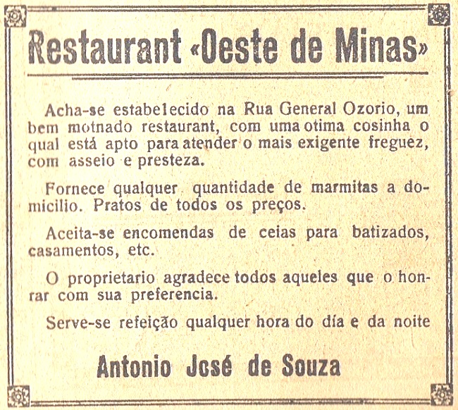 O patense Antônio José de Souza nasceu em 1.º de setembro de 1899. Sua primeira atividade comercial foi a de carpinteiro. Versátil, foi se desenvolvendo em outras atividades, como cerealista e proprietário de uma fazenda no vizinho município de Presidente Olegário, onde produzia um queijo bastante apreciado. Teve ativa participação na vida política local, sendo vice-presidente da antiga UDN, e ainda participante da União de Moços Catholicos. Em 1943, considerou oportuno enveredar por um novo ramo de negócios, estabelecendo na Rua General Osório um restaurant. E de acordo com o anúncio, o fogão de lenha funcionava 24 horas por dia. Antônio faleceu em 26 de março de 1962