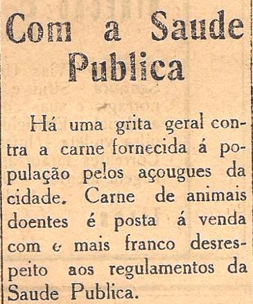 Há uma grita geral contra a carne fornecida á população pelos açougues da cidade. Carne de animais doentes é posta á venda com o mais franco desrespeito aos regulamentos da Saude Publica. A repartição competente necessita agir com energia para reprimir os abusos, organizando o exame previo dos animais a serem abatidos e a carne a ser distribuída. Um nosso leitor e assinante para comprovar a sua reclamação, trouxe à nossa Redação um pedaço de carne cheio de vermes (lombrigas) e aqui o deixou em exposição. Obtivemos informes que estes casos se repetem a miúdo. Esperamos que as providencias sejam tomadas com o fim de acautelar a saude da população.