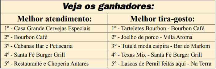 Na categoria atendimento, a melhor pontuação foi para o Casa Grande Cervejas Especiais, do proprietário João Paulo Reis Nogueira. Os organizadores do festival anunciaram, publicamente, os cinco mais bem colocados em cada uma das categorias. Todos eles foram agraciados com troféus e brindes dos apoiadores.