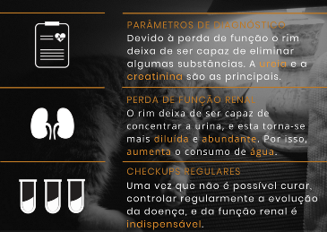 A doença renal crônica (DRC) define-se como uma síndrome clínica caracterizada pela perda progressiva das unidades funcionais dos rins, os néfrons, que evolui por um período extenso, geralmente por meses ou anos. O desafio desta doença é que os sinais clínicos não são evidentes até que haja uma perda de 67 a 75% dos néfrons, estágio em que os rins perdem sua capacidade compensatória. É considerada a maior causa de morbidade e mortalidade em cães e gatos. Nestes, estima-se que a doença ocorra em cerca de 10% da população felina como um todo, podendo afetar mais de 30% dos gatos acima de 10 anos de idade. A etiologia geralmente não é passível de ser descoberta, mas sabe-se que pode ter origem familiar, congênita ou adquirida. Causas potenciais para o desenvolvimento incluem: injúria toxica, hipóxia, obstrução de trato urinário superior, glomerulonefrite e infecções. Doenças de origem genética como doença renal policística, comum em gatos da raça persa, neoplasias como o linfoma e a nefropatia hipercalcêmica também são causas importantes da DRC em felinos.
