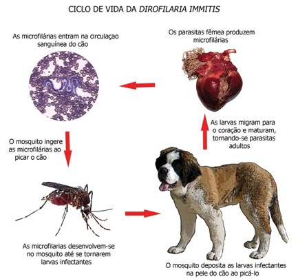 As fêmeas dos mosquitos servem como hospedeiros intermediários quando ingerem o sangue de um cão infectado contendo larvas de dirofilaria em seu primeiro estágio (L1). No mosquito as larvas evoluem para L2 e, posteriormente para L3, que é a forma infectante. Quando o mosquito pica um animal para se alimentar, as larvas L3 são depositadas, junto com a saliva, na pele do mesmo. Estas larvas penetram no tecido subcutâneo e aí permanecem por, aproximadamente, dois meses evoluindo para larvas L4 que penetram na circulação sanguínea e eventualmente na circulação linfática. À medida que migram na circulação sanguínea para o coração passam à larvas de quinto estágio ou adultos jovens, as quais se localizam nas pequenas artérias pulmonares. A gravidade da moléstia varia conforme o número de vermes adultos que o cão abriga, podendo variar de 1 até 250. Assim, localizam-se nas artérias pulmonares caudais em infecções com baixo número de adultos. Com o aumento do número de adultos podem ocupar o ventrículo direito, átrio direito e veia cava cranial caracterizando os casos mais graves.