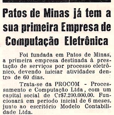* Fonte: Texto publicado na coluna Tribuna Estudantil com o título “Patos de Minas já tem a sua primeira Empresa de Computação Eletrônica” na edição n.º 40 de 31 de janeiro de 1982 da revista A Debulha, do arquivo de Eitel Teixeira Dannemann, doação de João Marcos Pacheco.