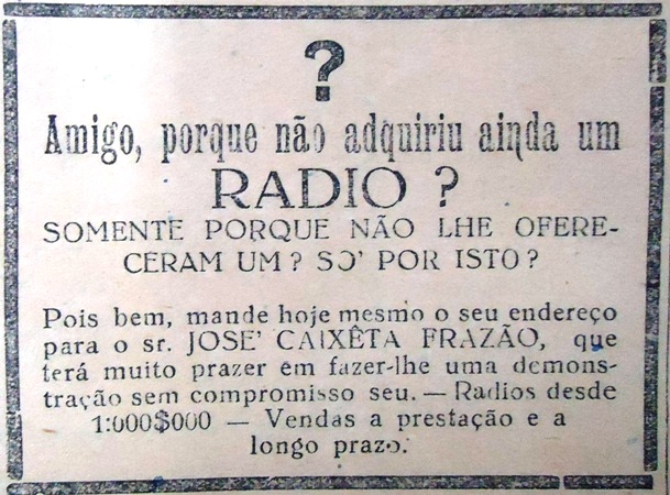 A década de 1930 marcou o apogeu do rádio como veículo de comunicação de massa, refletindo as mudanças pelas quais o país passava. O crescimento da economia nacional atraía investimentos estrangeiros, que encontravam no Brasil um mercado promissor. A indústria elétrica, aliada à indústria fonográfica, proporcionou um grande impulso à expansão radiofônica. Patos de Minas, atenta às novidades do mercado, anunciava o rádio com grande alarde. É o caso deste exemplo, publicado pelo negociante José Caixeta Frazão¹.