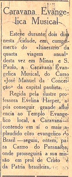 Fundado em 08 de fevereiro de 1928, o Instituto José Manuel da Conceição (IJMC) – nome que homenageia o primeiro brasileiro ordenado ao ministério evangélico – era uma obra de cooperação entre várias igrejas evangélicas brasileiras e algumas organizações missionárias norte-americanas. Graças ao trabalho pioneiro e competente da Missionária Evelina Harper (1899-1989), a música foi incluída entre as disciplinas obrigatórias no currículo da escola. Ela tinha consciência da importância da música na formação básica dos futuros pastores. Foi em 1940 que o coral do IJMC fez a primeira viagem com o nome que a consagraria: Caravana Evangélica Musical. Em 1943 a Caravana esteve em Minas Gerais, visitando as igrejas de Três Corações, Varginha, Lavras, Campo Belo, Formiga, Ibiá, Patrocínio, Patos sem ainda o “de Minas”, Carmo do Paranaíba, Uberaba e Uberlândia, e em São Paulo, na capital, Franca e Mogi Mirim. O IJMC encerrou suas atividades em 1970. Aqui, o anúncio da visita a Patos.