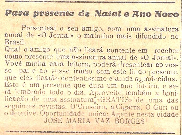 Antes da fundação do seu Jornal dos Municípios em 24 de maio de 1956 e da carreira política, José Maria Vaz Borges, aos 19 anos de idade¹, já era apaixonado por este meio de comunicação. Eis aí neste anúncio o nosso prezado jornalista em sua fase inicial de jornaleiro representante sugerindo as pessoas presentear os amigos no Natal e Ano Novo com a assinatura de O Jornal com a bonificação da assinatura de uma revista.