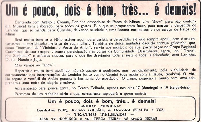 No início da década de 1980, Leninha foi ativa participante das atividades culturais patenses, tanto sozinha quanto acompanhada de outros músicos e marcante no Grupo Regional Carinhoso¹ e no espetáculo Vinícius − O Poeta do Amor², pela sua linda voz e belas interpretações. Certo dia ela resolveu se mudar para Curitiba. Para tanto, convidou seus colegas Anísio Dias e Marco Antônio Comini para duas apresentações de despedida, como destaca esse evento musical.