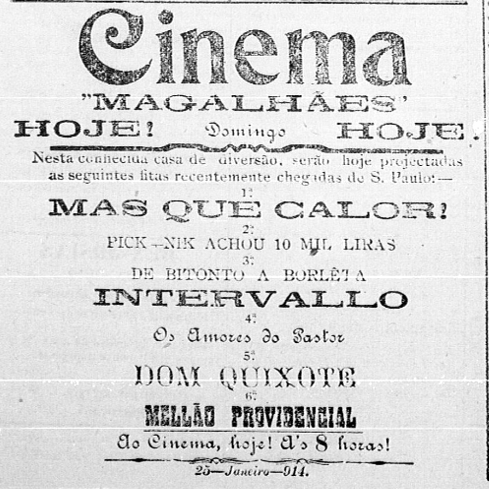 O Cine Magalhães¹ foi o primeiro local próprio para cinema construído em Patos de Minas, inaugurado em 10 de maio de 1913, na esquina da Rua Olegário Maciel com Avenida Getúlio Vargas. Dispunha de 105 assentos avulsos, além dos destinados a assinantes. Possuía ainda cadeiras especiais e camarotes cativos, ocupados apenas pelos membros da família. Aqui, o anúncio da sessão de 25 de janeiro de 1914.