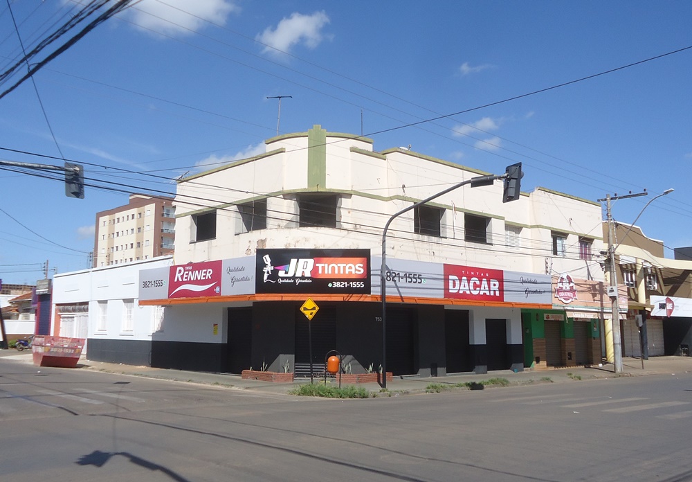 Não sou de comparar memória de imóvel com memória de humano, mas minhas paredes estão coçando de vontade de perguntar, por isso vou perguntar: você aí sabe como era o calçamento da Avenida Brasil no início da década de 1960? Bem, como a maioria não sabe, eu digo que era de bloquetes². E agora fiquem sabendo também que eu vim ao mundo nessa esquina aqui³ antes dos bloquetes. E quando eu vim ao mundo, por aqui eram poucos os imóveis de dois andares como eu. Assim ficou durante muitos anos, e tinha também muitos galpões e eu me lembro bem daquele que tinha a marcenaria do Seu Clóvis4. Eu sempre fui assim, comércio embaixo e moradia em cima. Foram tantos moradores que nem me lembro mais de muitos deles. De comércio, teve uma farmácia que, dizem, fabricava uma essência de groselha pra fazer refresco que era supimpa. Aí, gente boa, o trem petecou quando as casas foram sendo demolidas para a construção de edifícios. Olha um dos bitelos aí atrás de mim. E a coisa está se intensificando de uma maneira tal que já estou botando minhas paredes de molho na expectativa de que algo do tipo está para acontecer comigo. Afinal, se não respeitaram nem o imóvel do nosso primeiro prefeito, vão me respeitar? Ora bolas, é evidente que não. Bem, vou levando a vida sem saber quando a tragédia chegará a mim. O resto é História, e eu faço parte dela. Pelo menos isso. E quando chegar a minha vez, deixarei saudade!