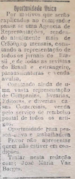 Antes da fundação do seu Jornal dos Municípios, em 24 de maio de 1956, e da carreira política, José Maria Vaz Borges, em 1943, aos 19 anos de idade¹, já era apaixonado por este meio de comunicação. Foi quando passou a representar jornais e revistas do Brasil e do exterior². Um ano depois, em setembro/1944, sem sabermos o motivo, ele lança esse anúncio aí comunicando que vai deixar o ramo e é sucinto: Por motivos que serão explicados ao comprador. Mas eis que, três meses depois, ele volta a anunciar que continua no ramo³. O que teria acontecido?