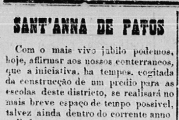 Com o mais vivo jubilo podemos, hoje, affirmar aos nossos conterraneos, que a iniciativa, ha tempos, cogitada da construcção de um predio para as escolas deste districto, se realisará no mais breve espaço de tempo possivel, talvez ainda dentro do corrente anno.