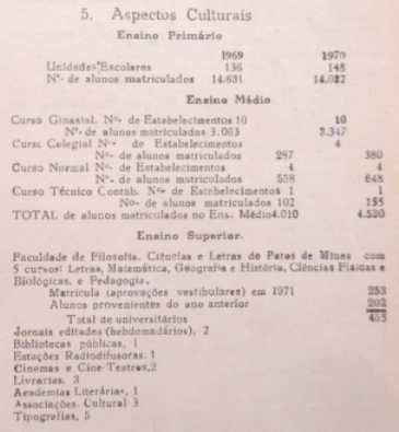 Faculdade de Filosofia, Ciências e Letras de Patos de Minas com 5 cursos: Letras, Matemática, Geografia e História, Ciências Físicas e Biológicas, Pedagogia. Matrícula (aprovações vestibulares) 1971: 253. Alunos provenientes do ano anterior: 202. Total de universitários: 455.