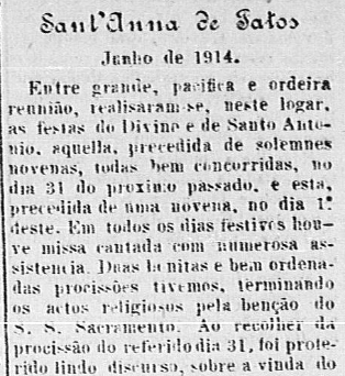 Entre grande, pacifica e ordeira reunião, realisaram-se, neste logar, as festas do Divino e de Santo Antonio, aquella, precedida de solemnes novenas, todas bem concorridas, no dia 31 do proximo passado, e esta, precedida de uma novena, no dia 1.º deste. Em todos os dias festivos houve missa cantada com numerosa assistência. Duas bonitas e bem ordenadas procissões tivemos, terminando os actos religiosos pela benção do S.S. Sacramento. Ao recolher da procissão do referido dia 31, foi proterido lindo discurso, sobre a vinda do Divino Paraclito, pelo nosso Rmo. Vigario P. Agostinho Christobal. A parte musical foi desempenhada pelas bandas locaes, “Lyra Santannense” e “União Juvenil”, incorporadas.