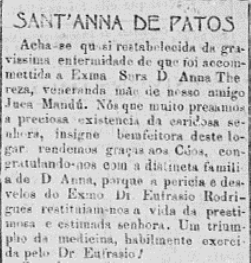 Acha-se quasi restabelecida da gravissima enfermidade de que foi accommettida a Exma. Snra. D. Anna Thereza, veneranda mãe de nosso amigo Juca Mandú. Nós que muito presamos a preciosa existência da caridosa senhora, insigne bemfeitora deste logar, rendemos graças aos céos, congratulando-nos com a distincta familia de D. Anna, porque a pericia e desvelos do Exmo Dr. Eufrasio Rodrigues restituiam-nos a vida da prestigiosa e estimada senhora. Um triumpho da medicina, habilmente exercida pelo Dr. Eufrasio!