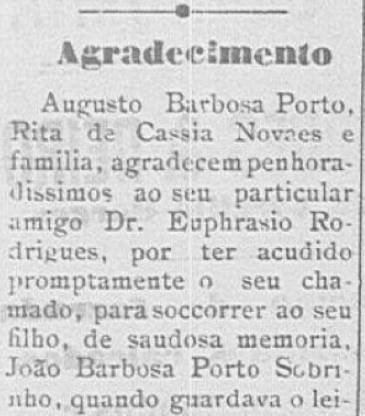 Augusto Barbosa Porto, Rita de Cassia Novaes e familia, agradecem penhoradissimos ao seu particular amigo Dr. Euphrasio Rodrigues, por ter acudido promptamente o seu chamado, para socorrer ao seu filho, de saudosa memoria, João Barbosa Porto Sobrinho, quando guardava o leito da dor; ao seu enfermeiro e amigo Estevão Antonio Nepomuceno, aos amigos que velaram dia e noite, guardando o leito do doente; aos amigos que se prestaram, viajando noite e dia, e aos que auxiliaram, em busca de medicamentos para aliviarem as dores do seu filho; a todas as pessoas que os honraram com suas visitas durante a enfermidade do mesmo; ao vigario José Affonso Pahinhas, que, de boa vontade, ministrou os sacramentos instituidos pela Igreja; aos amigos de Lagoa Formosa, que se dignaram comparecer, e aos que fizeram-se representar, e, finalmente, a todos que fizeram a caridade de acompanhar os restos mortaes do referido seu filho, até a sua ultima morada.