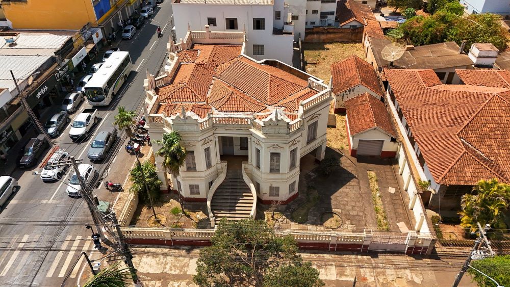 Amadeu Dias Maciel e sua sobrinha-esposa Jorgeta Maciel moravam num imponente sobrado na rua hoje denominada Olegário Maciel¹. Em 1919, iniciou a construção de uma nova residência na esquina da mesma Rua Olegário Maciel com a Avenida Municipal, que depois receberia o nome de Getúlio Vargas, cujo Alvará de Licença de Construção lhe foi concedido pela Câmara Municipal em 12 de maio daquele ano. Ao descrever o imóvel, o Patrimônio Cultural do município esclarece, entre outros detalhes, que a solução arquitetônica dada ao mesmo é singular². Aqui, Lizandro Júnior registrou o palacete com o seu drone.
