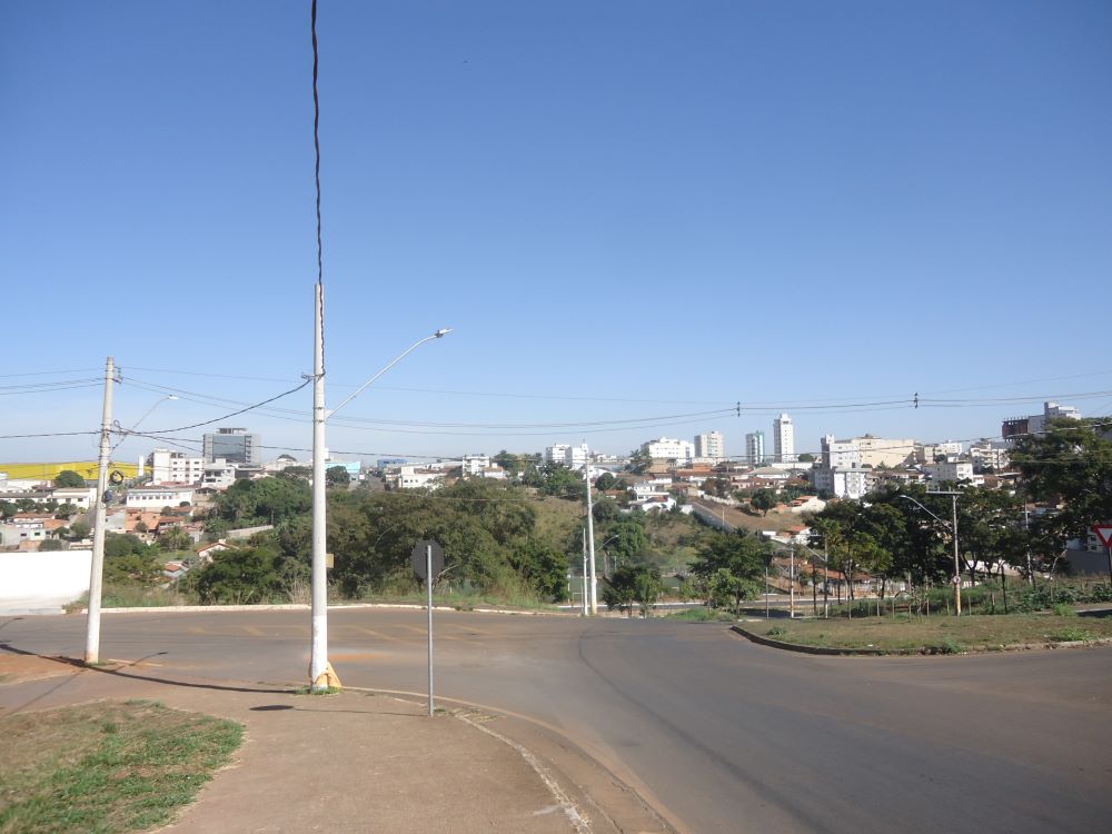 Abaixo, o vale do Córrego do Monjolo com a Avenida Fátima Porto. Subindo o morro com um pouco que resta da mata nativa, o Bairro Cônego Getúlio. Adiante, seu colega Lagoa Grande. Duas curiosidades nos extremos: à esquerda, em amarelo, o Supermercado BH; à direita, o edifício-esqueleto.