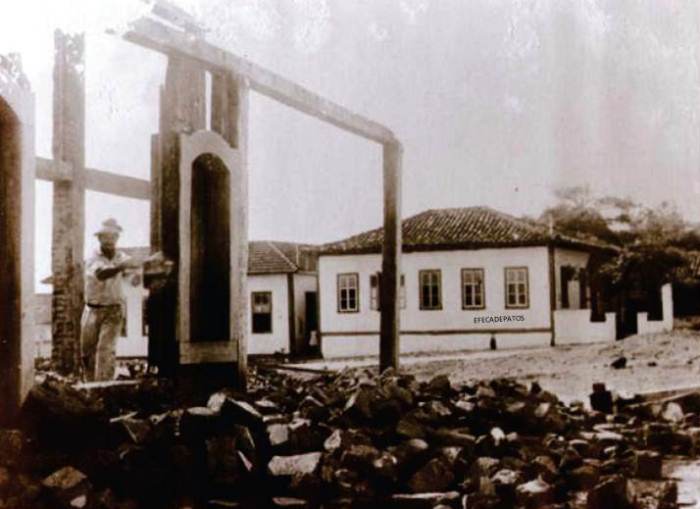 Em 13 de junho de 1942 a nova Matriz é aberta, provisoriamente, ao culto. Em 13 de junho de 1954, já com o interior todo pronto, exatamente vinte anos após o lançamento da pedra fundamental, é aberta definitivamente. Então, a antiga Matriz foi literalmente abandonada. As informações sobre o porquê a antiga foi demolida são controversas, às vezes totalmente contraditórias. Uma versão diz que ela estava prestes a ruir e não compensava a reforma. Outra versão diz que era um contrassenso aquela “velharia” estar tão perto da nova. Há até uma versão folclórica: Um dia algum responsável pelo velho templo ouviu dizer que ele seria tombado. Como o sujeito não era lá muito inteligente, entendeu de forma errada e mandou derrubar a igreja. O que importa é que ela, a velha e sofrida Matriz, depois da nova tomar o seu lugar, esperou pela morte durante longos onze anos até ser demolida em 1965 e ficar eternamente na memória daqueles que a frequentaram. Ao fundo, à direita, a antiga residência do professor Modesto de Mello Ribeiro, e ao lado, a do Dr. João Borges.